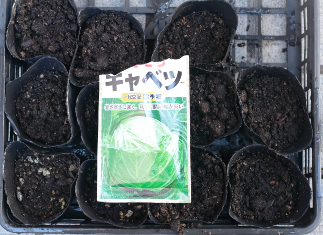 と言うことで、育苗ポットにキャベツの種を撒きました。