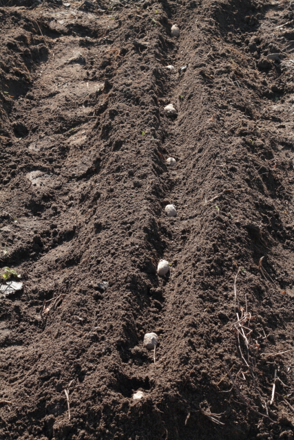畝立て後、写真のようにカット面を下にして種芋を置いていきます。 30cm間隔で置いていきます。
