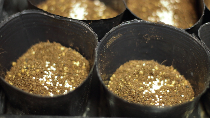 種まきの前にHB-101を混ぜ込みます。活性剤を入れるのはわりと効果が有りますよ。白い粒がHB-101です。