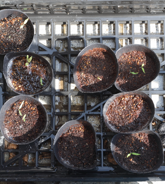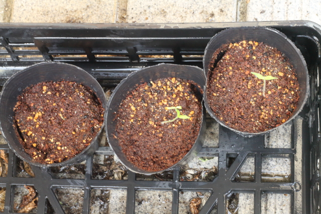 外に出していたトマトの育苗ポットも少しずつ発芽数が増えてきました。