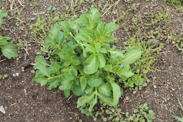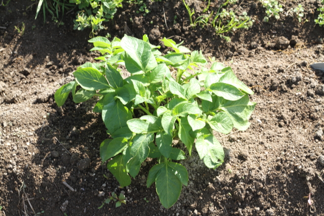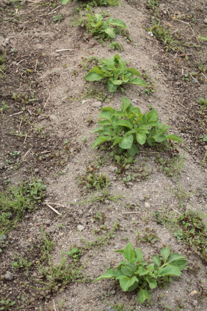 今日家庭菜園に行くと、ジャガイモの芽が大きくなった感じです。追肥の効果でしょうかね。