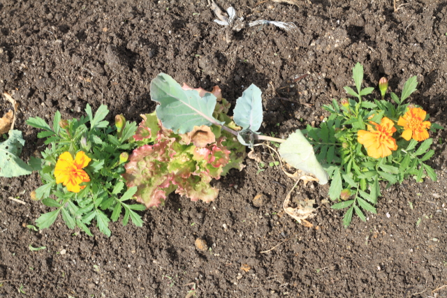 レタスもマリーゴールドも虫除け効果も期待できるので、アブラナ科の野菜をこの時期に作るには混植して損はないのかなと感じます。もっとも、モンシロチョウは飽和攻撃してきますので、コンパニオンプランツだけでは防ぎきれないのも事実と思います。工夫して被害を少なく持って行けるように色々アイデアを考えましょう!