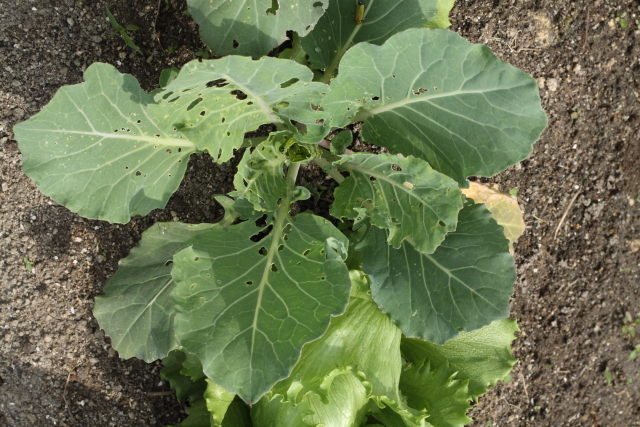 現状はオルトランが効いているはずなのでアオムシは駆除できるはずです。葉に虫食いの穴が見られますが、アオムシの姿は見られないのでオルトランが効いていると判断できます。根性があるのか(笑)残っているアオムシは捕まえて駆除していますがあまり数はいない感じですね。これからはモンシロチョウがどんどん増えてくるのでキャベツに近寄らないようコンパニオンプランツの活躍に期待です。