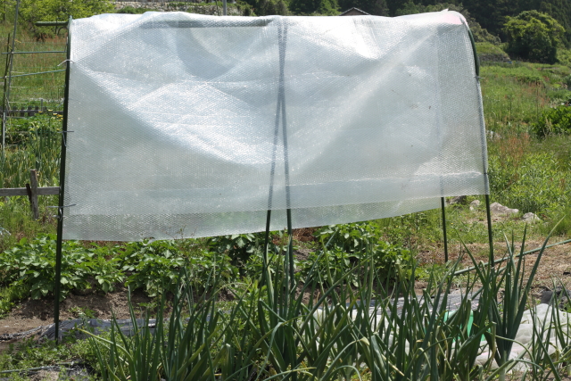 支柱立てが終わると、雨よけのビニールシートをかぶせます。トマトはあまり水は必要ないのとカラスなどの野鳥除けに期待して覆っておきます。もうすぐ収穫という時にカラスなどに囓られたら目も当てられませんからね(笑)。