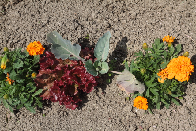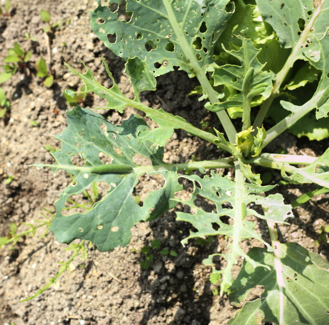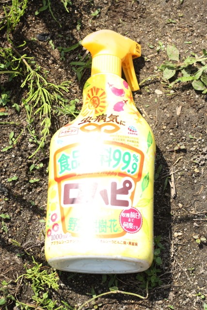 畝が乾燥しているので給水することに。すると、葉の裏に隠れていたアオムシが出てきたのでもちろん駆除。先にスプレーした鷹の爪天然農薬も流れたので、もう一度全体にスプレーしておくことに。木酢液の匂いなどでモンシロチョウが産卵に来ないかもしれないと期待していますが、どうでしょうかね? 見ているとあまり近づいて来ない気もしたのですが、希望的観測は持たないようにしましょう。