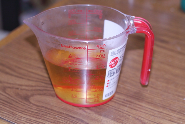 1回目300cc、2回目200cc、合計500ccほど鷹の爪煮液が完成したので次は木酢液と合わせます。木酢液は5cc入れて100倍液にしました。次はスプレーボトルに液を移して完成です。くしゃみの鼻水に悩まされましたが完成です。