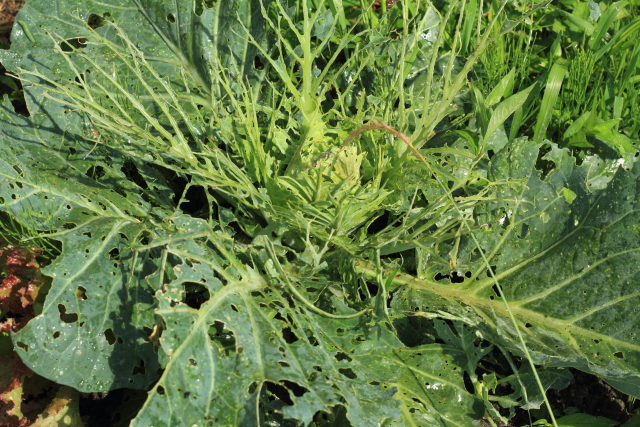 写真の様に葉を食べ尽くされていますが、中心の結球は持ちこたえているかなという感じですね。モンシロチョウが増え出すと一気にこの様子。コンパニオンプランツだけではどうしようもないなという感じです。